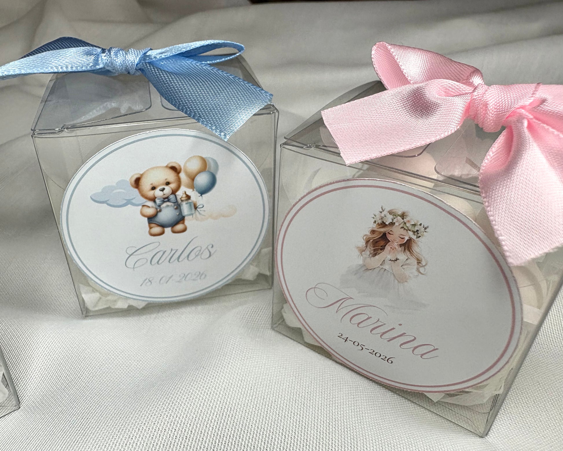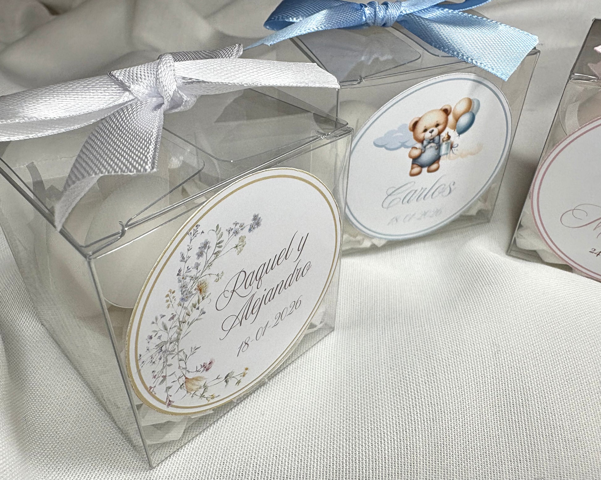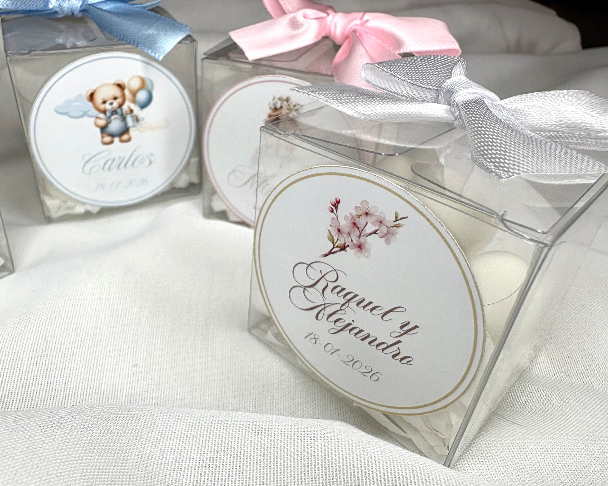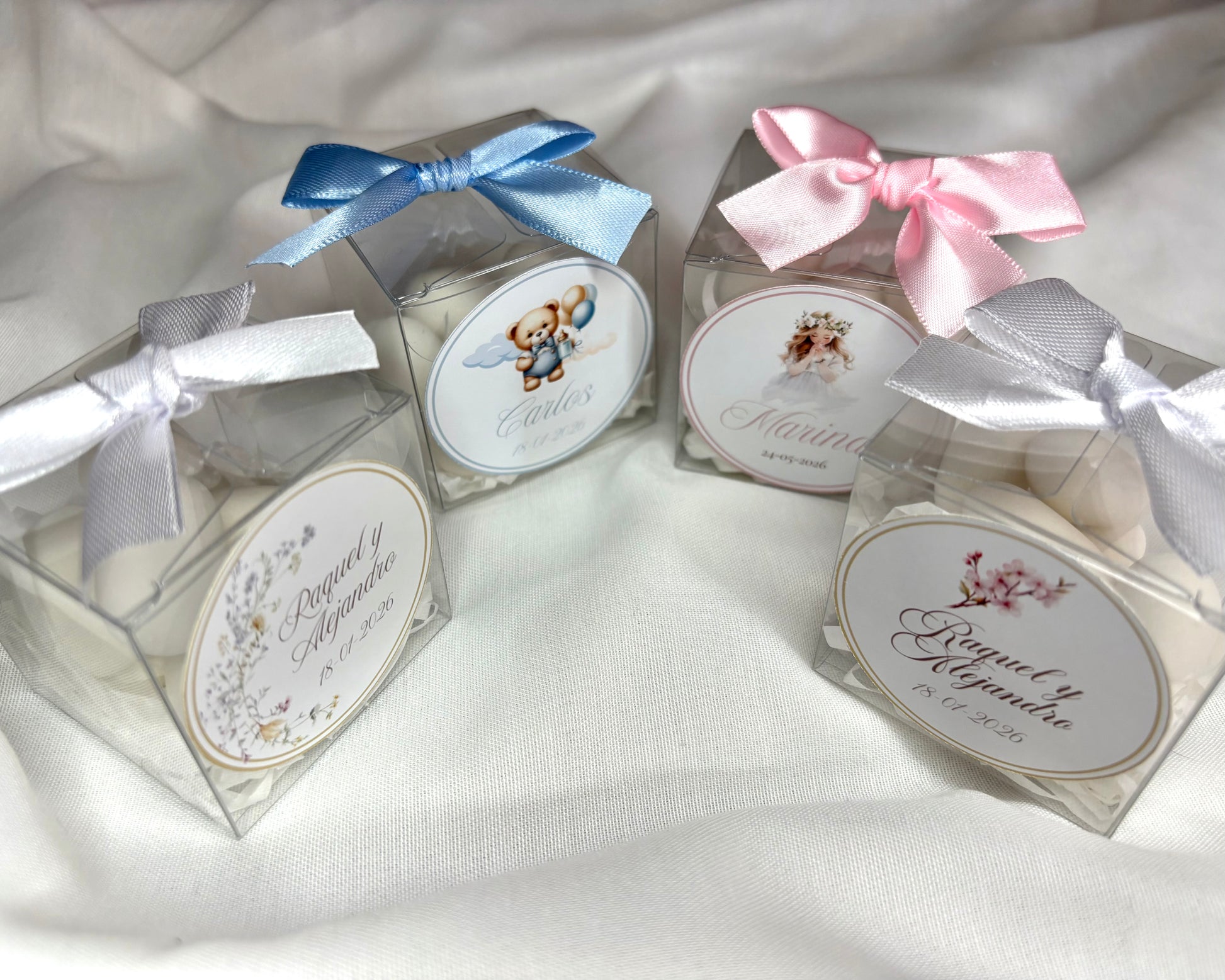 Nuestras cajitas transparentes incluyen peladillas de almendra recubiertas, perfectas para bodas, comuniones y bautizos.