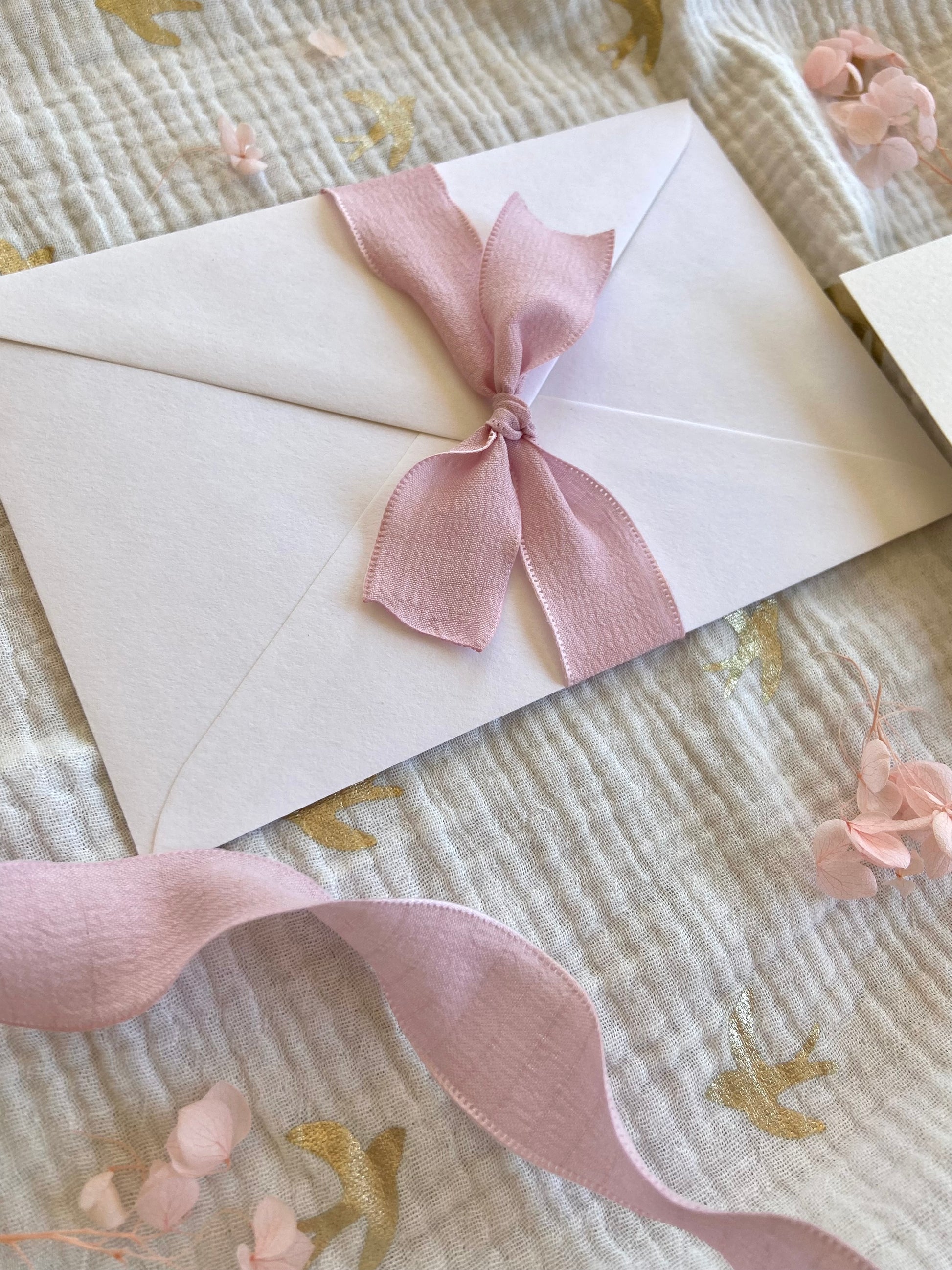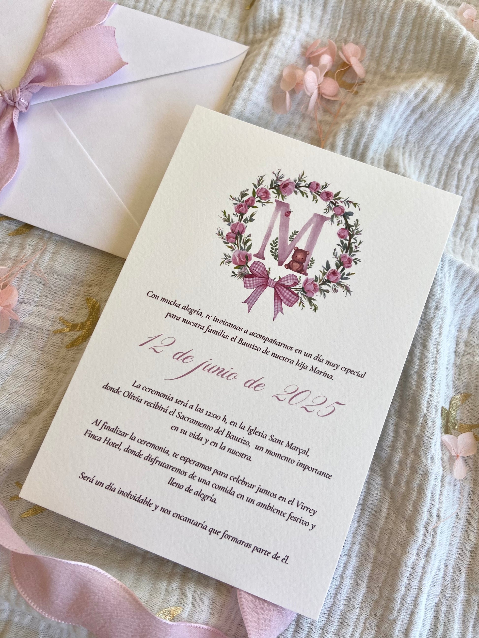 Con una cuidada selección tipográfica y un sobre a juego con lazo rosa incluido, es ideal para bautizos con estilo romántico, natural y lleno de detalles.