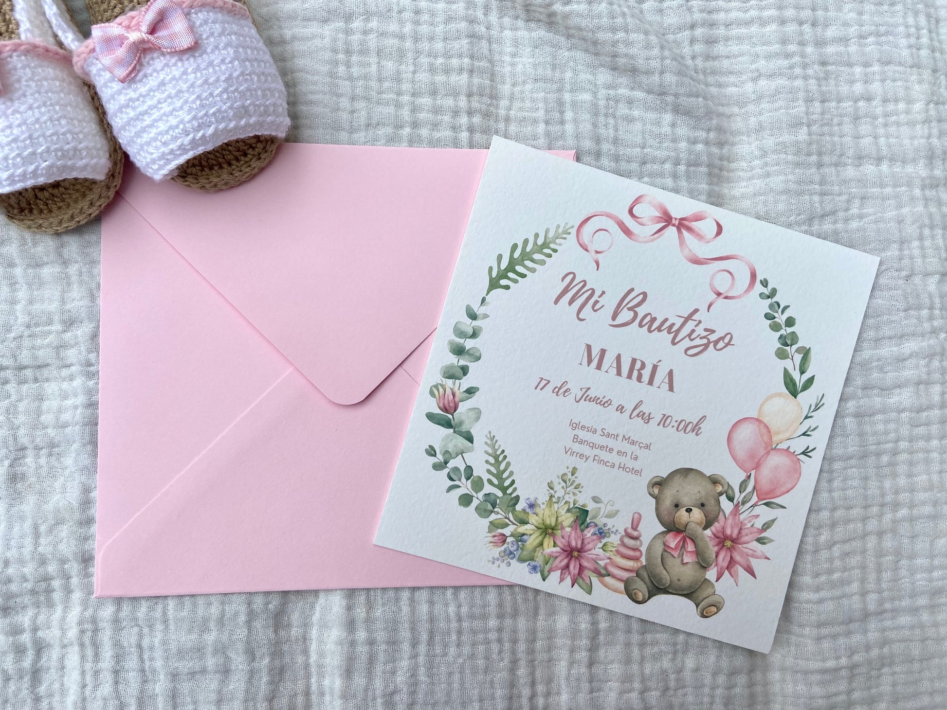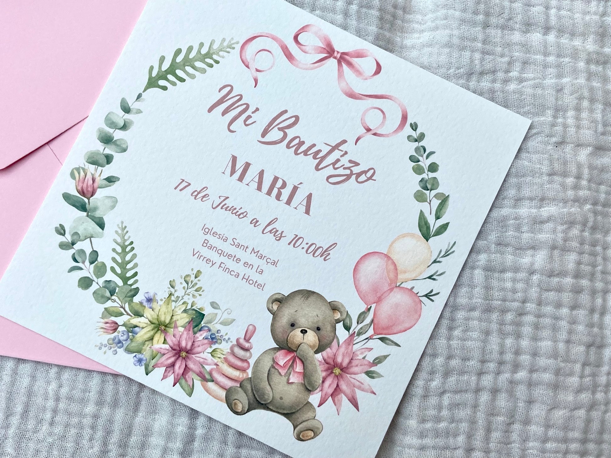 Celebra el bautizo de tu bebé con nuestra encantadora invitación "Corona Osito" en delicados tonos rosa. El diseño presenta un adorable osito rodeado por una corona de hojas y pequeñas flores, simbolizando la ternura y pureza de este día tan especial. Impresa en papel de alta calidad, esta invitación combina dulzura y elegancia, y es completamente personalizable con el nombre de tu bebé y los detalles de la ceremonia. Comparte este momento único con tus seres queridos de una forma inolvidable y llena de cariño.