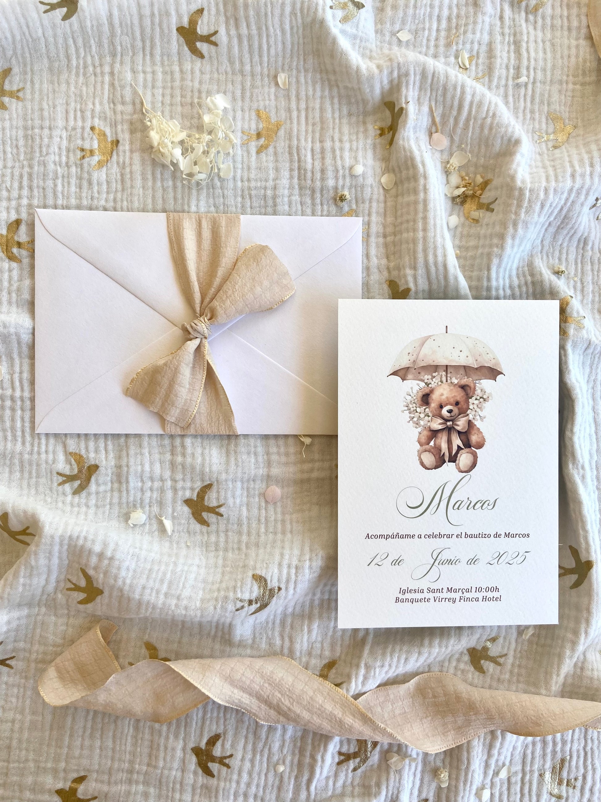 Una invitación encantadora y suave, ideal para anunciar el bautizo de tu hijo con un toque otoñal y delicado. El diseño muestra un osito tierno bajo un paraguas, rodeado de flores en tonos beige, transmitiendo protección, dulzura y cariño.