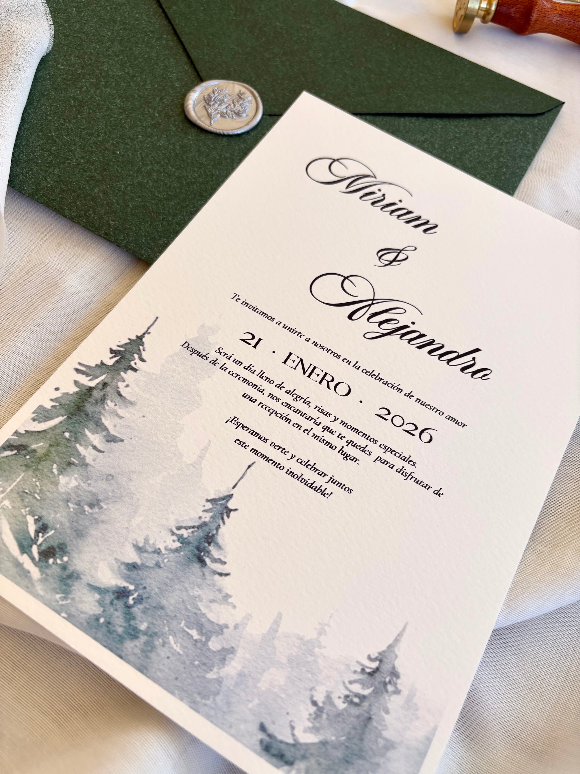 Un diseño elegante en acuarela con pinos nevados, perfecto para bodas de invierno o celebraciones rodeadas de naturaleza. El sobre en tono verde oscuro con sello de lacre añade un toque sofisticado y único, ideal para parejas que buscan una invitación con encanto natural y atmósfera invernal.