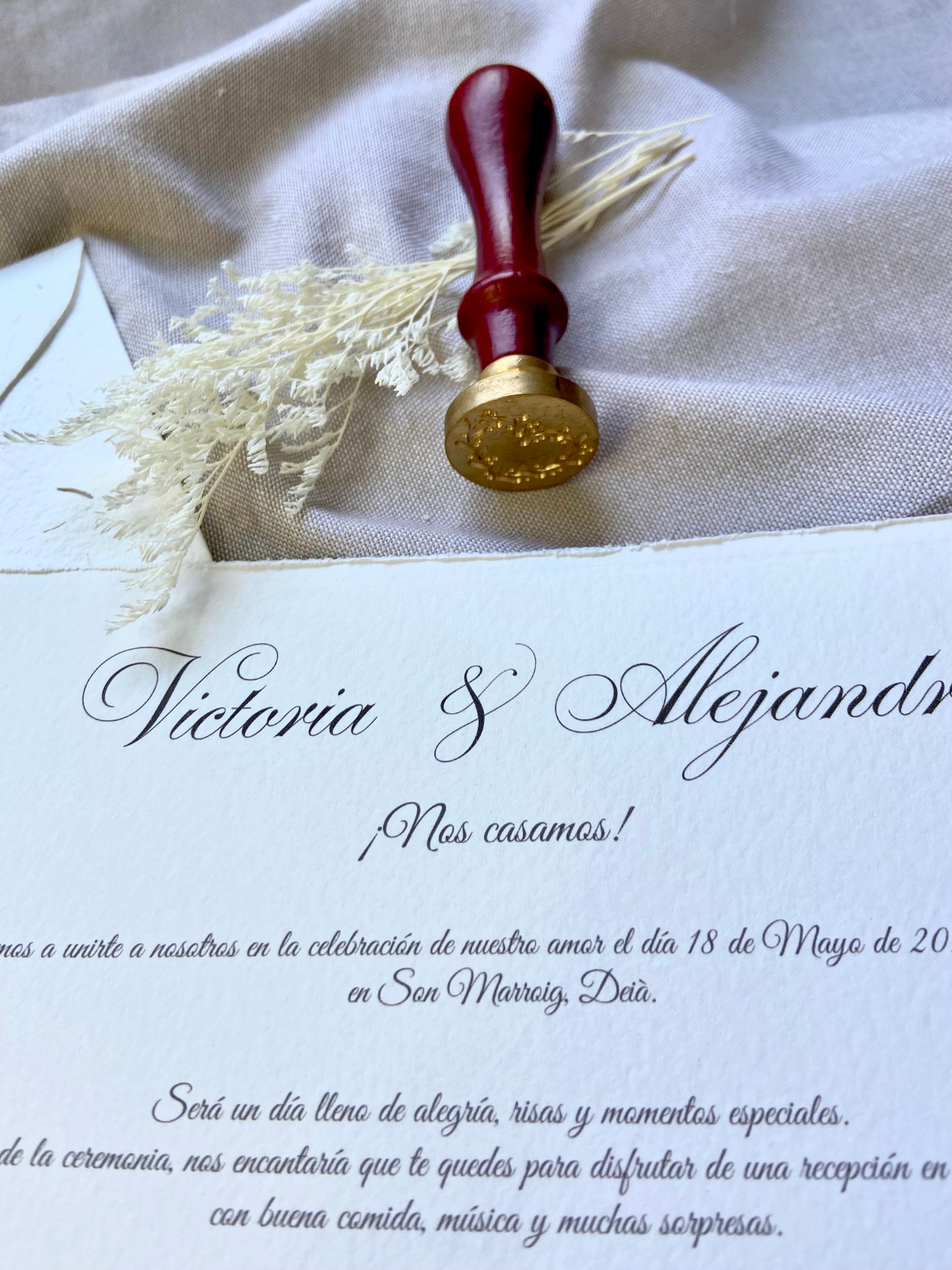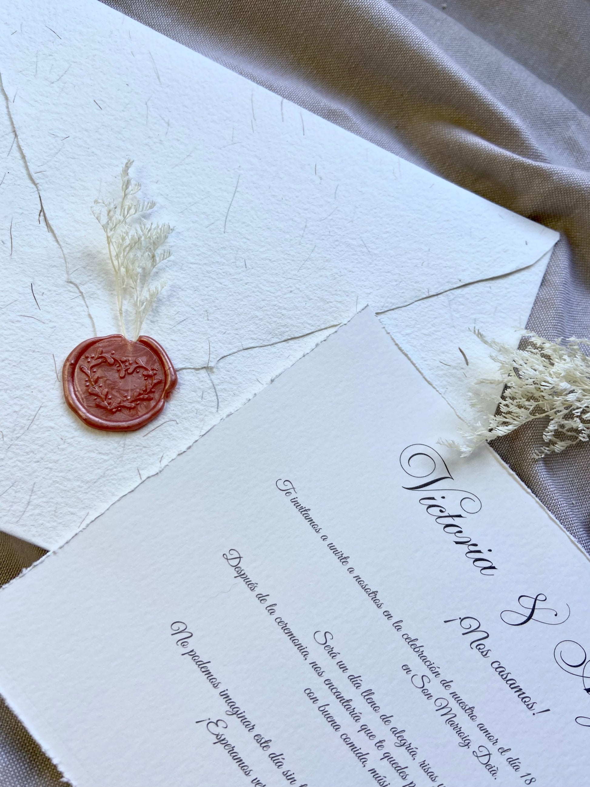 Impresas en papel de alta calidad con textura y bordes rasgados, cada invitación se acompaña de un sobre artesanal sellado con lacre.