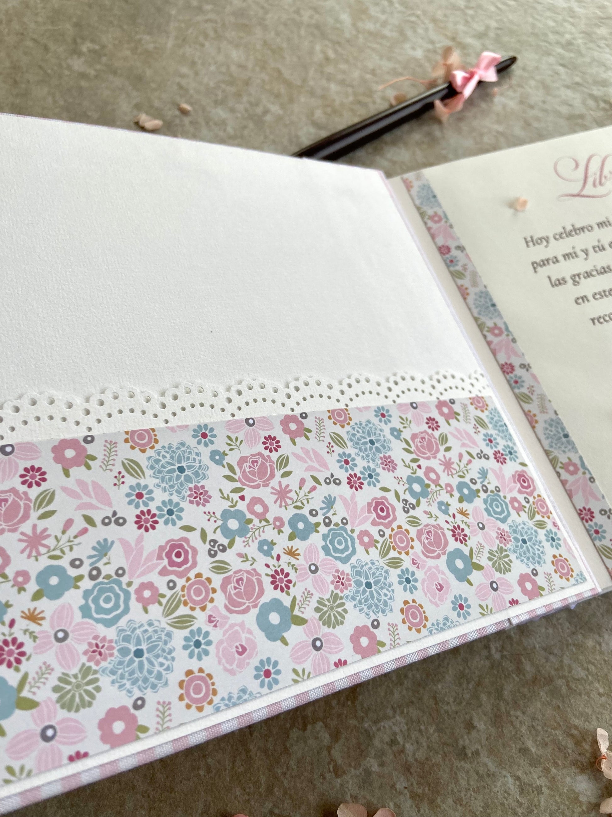 Puedes pedir este diseño tal como aparece en las imágenes (el diseño del papel de flores puede variar, dependiendo del stock que tengamos). Pero si prefieres otro de los diseños que tenemos disponibles o quieres hacer alguna modificación (como cambiar la portada o añadir algún detalle dentro de lo posible), escríbenos por privado y hablamos encantadas. ¡Seguro encontramos la opción perfecta para ti!