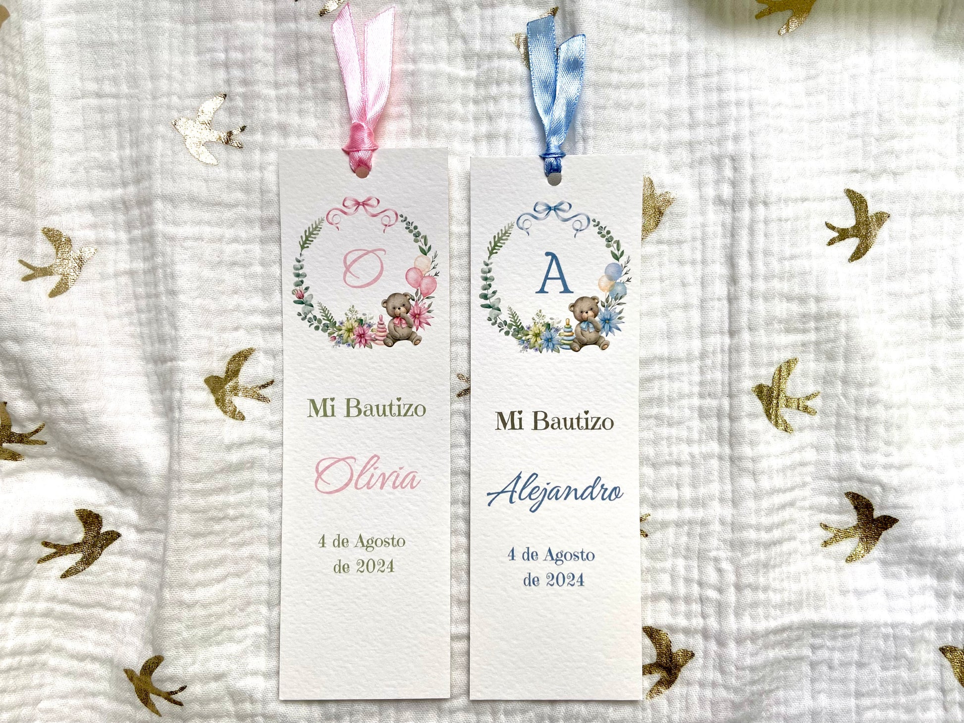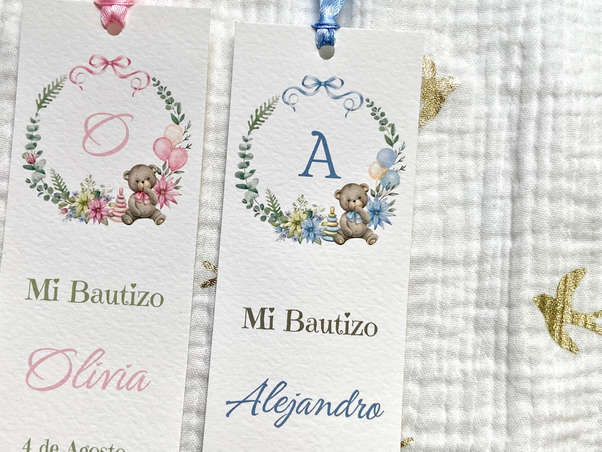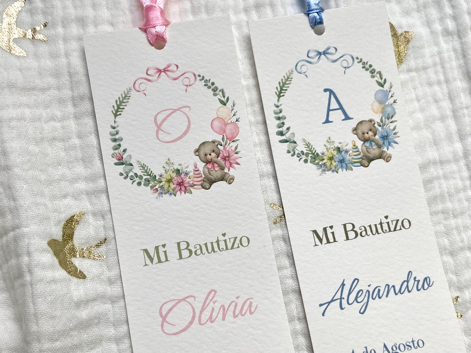 Celebra el bautizo de tu pequeño o pequeña con estos delicados marcapáginas ''Corona Osito'', disponibles en tonos azul y rosa para elegir. Con un diseño encantador de un osito rodeado de una corona de hojas, estos marcapáginas son el detalle perfecto para regalar a tus invitados y recordar un día tan especial. Personalizables con el nombre y la fecha del bautizo, cada marcapáginas está elaborado en papel de alta calidad y presenta un acabado elegante y duradero, ideal para conservar un recuerdo lleno de cariño.