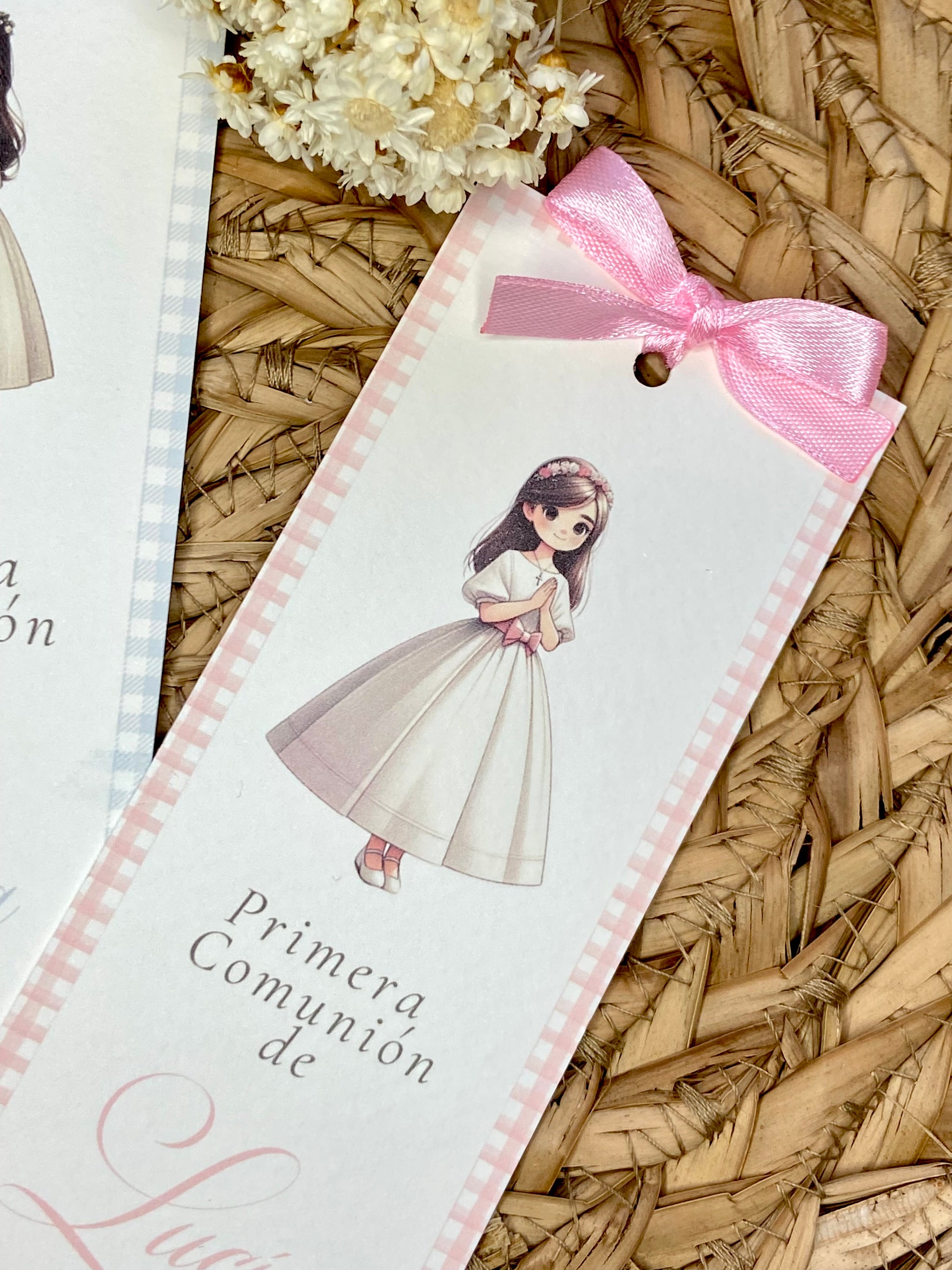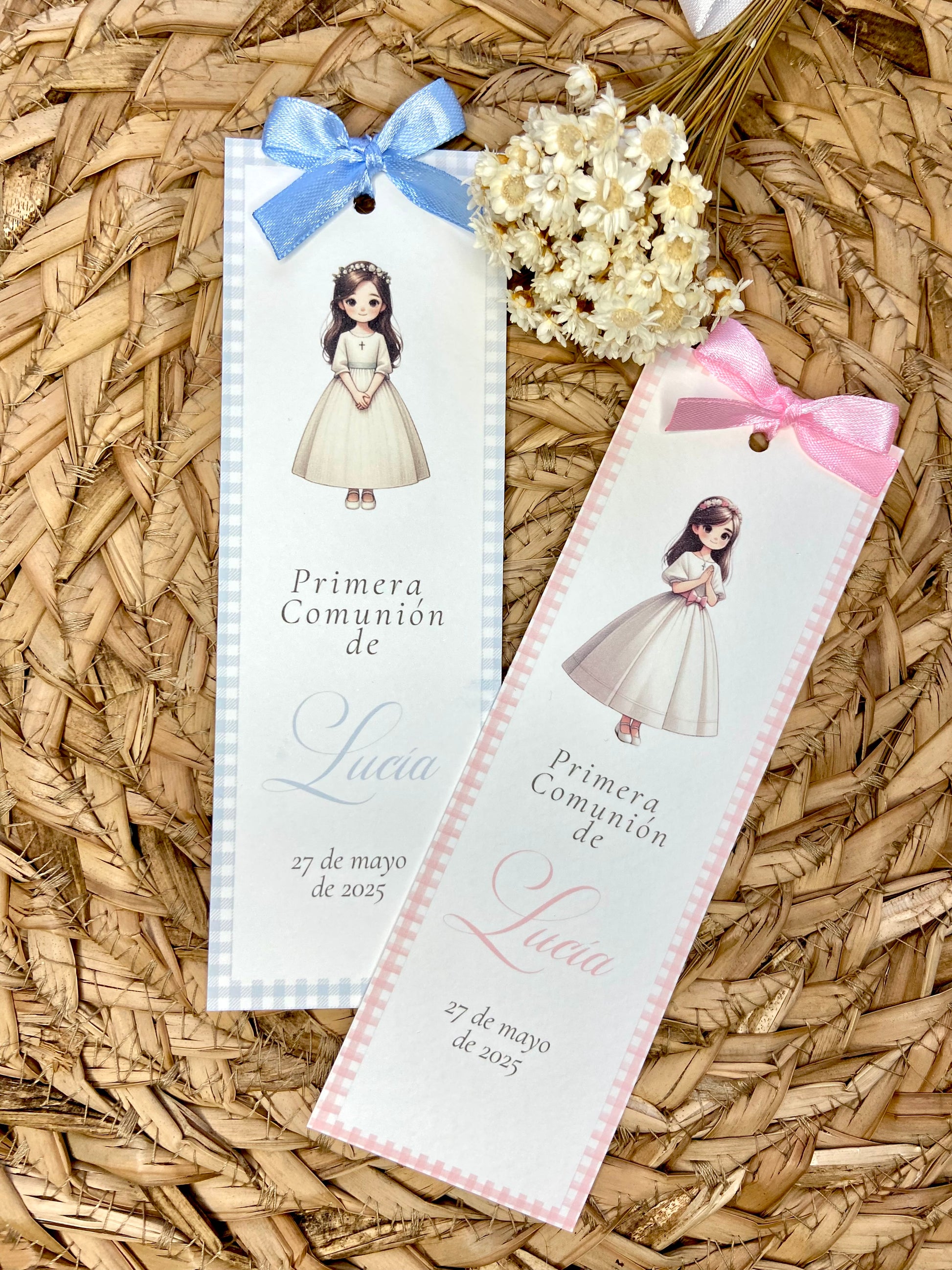 Marcapáginas de comunión para niña disponibles en dos delicados modelos: uno en tono rosa y otro en azul, para elegir el que mejor se adapte a su estilo. Con un diseño elegante y detalles encantadores, es el recuerdo ideal para que los invitados lleven consigo un pedacito de este día tan especial. Un toque de ternura para acompañar cada lectura y recordar siempre este momento único.