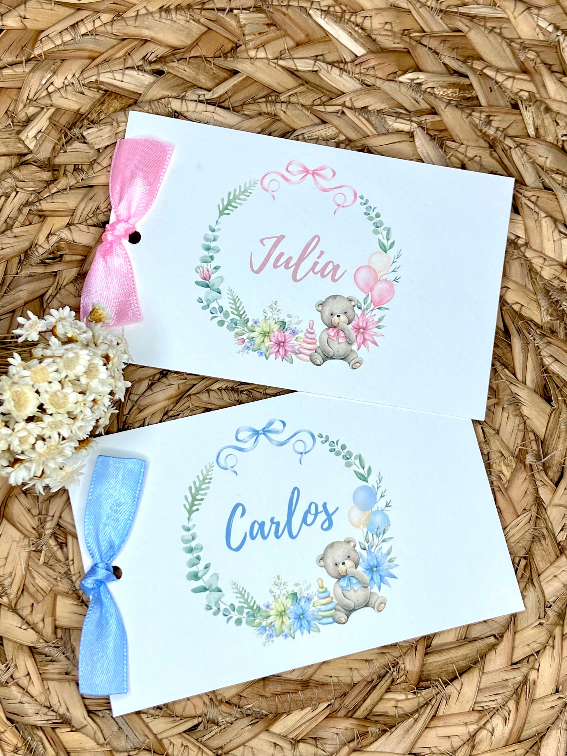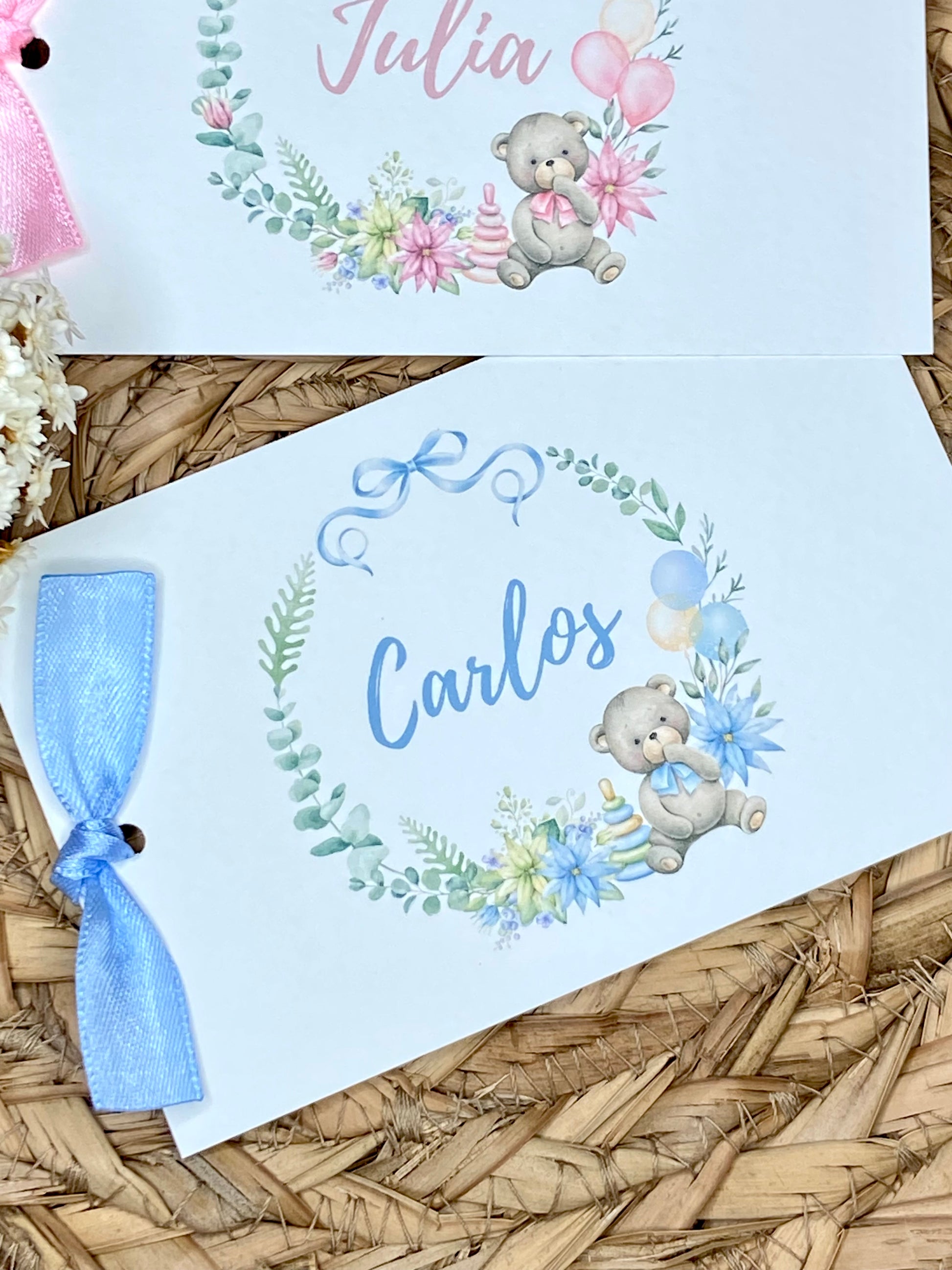 Celebra el bautizo de tu pequeño con estos encantadores marcasitios con lazo en forma de corona, adornados con un tierno osito. Perfectos para añadir un toque especial a la decoración de la mesa, estos marcasitios están disponibles en dos versiones: rosa delicado, ideal para un toque suave y dulce, o azul celeste, para una ambientación fresca y elegante. Cada uno está diseñado con detalle y cuidado, creando un recuerdo inolvidable para tus invitados. ¡Elige el color que mejor combine con tu celebración!
