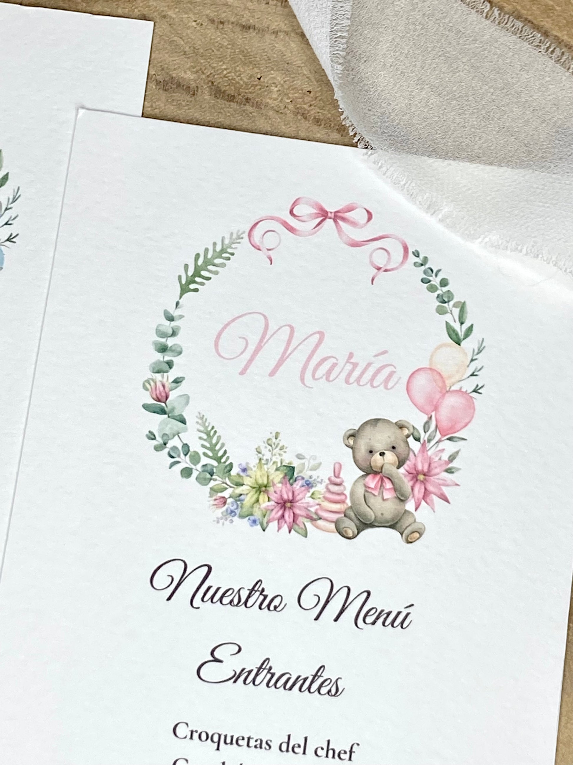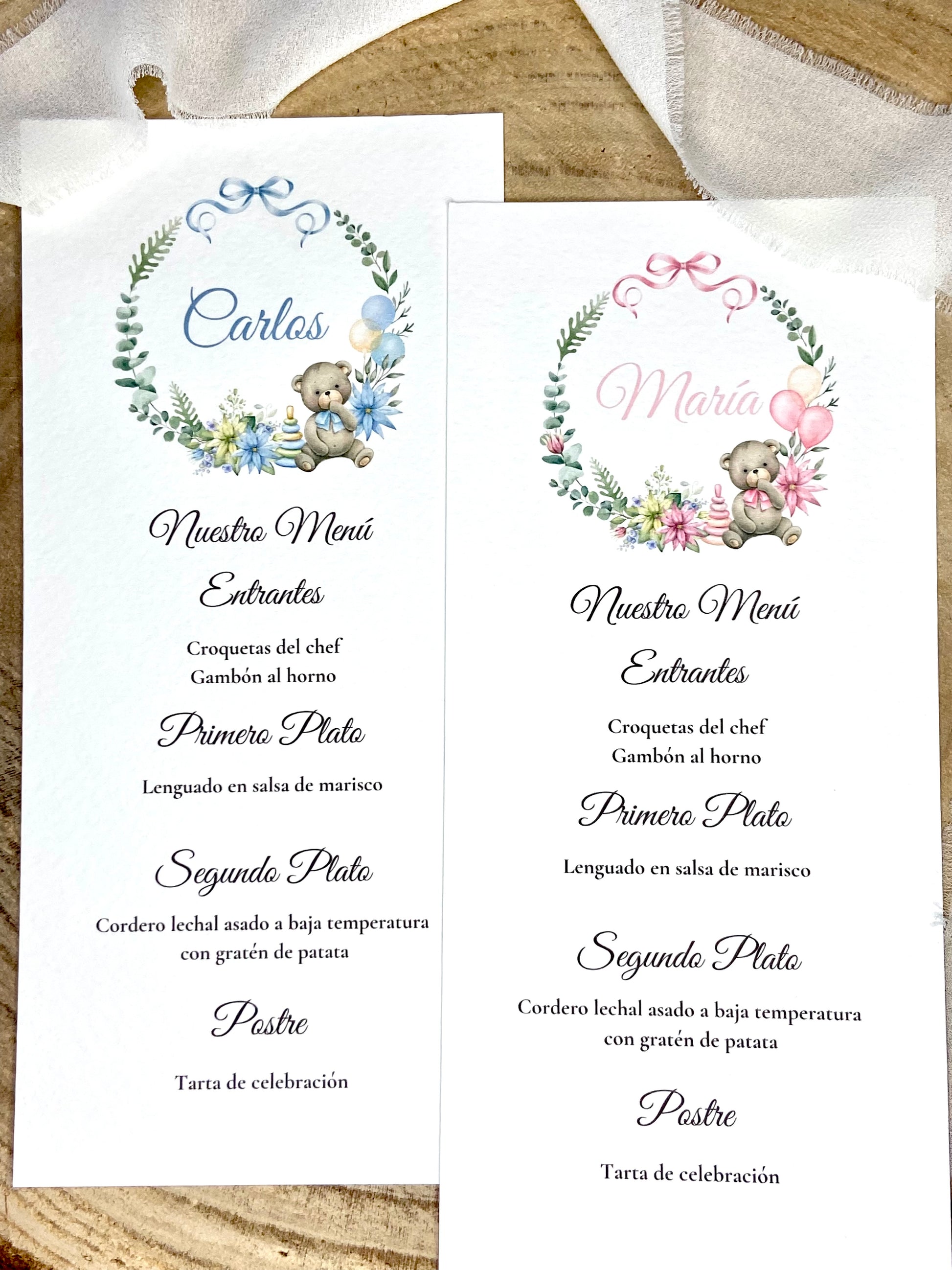El menú de bautizo 'Corona Osito' es la opción perfecta para añadir un toque de elegancia y dulzura a tu celebración. Con un adorable osito rodeado de una delicada corona, este diseño simboliza protección y amor, ideal para acompañar a tus invitados durante el banquete. Disponible en suaves tonos, este menú se convierte en un recuerdo inolvidable de un día tan especial.